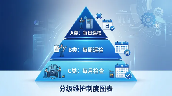 建立分层级矩阵:A类设备日巡周保,B类设备周巡月保,C类设备每月启动热身。引入工业听诊器(振动分析、红外热像)进行状态监测。采用 ABC 备件库存法及寿命预测模型。