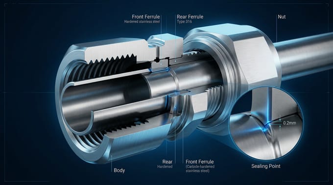 在工业流体系统中,管道连接是保障系统安全运行的核心环节。双卡套接头作为一种无需焊接、可重复拆装的机械连接方式,凭借其卓越的密封性能和抗振动能力,广泛应用于石油化工、半导体制造、航空航天等领域。其密封可靠性并非单一因素决定,而是精密结构设计、优质管材选择与先进制造工艺共同作用的结果。本文将从双卡套接头的结构原理、管材适配性及协同作用机制三个维度,深入解析其实现可靠密封的核心逻辑。