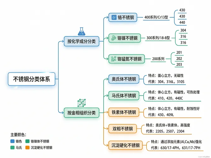 不锈钢的分类可以从多个角度进行,主要包括化学成分、金相组织、性能特点和用途等。其中,按金相组织分类是最常见且具有代表性的方法,能够直观反映不锈钢的内部结构和性能特点。